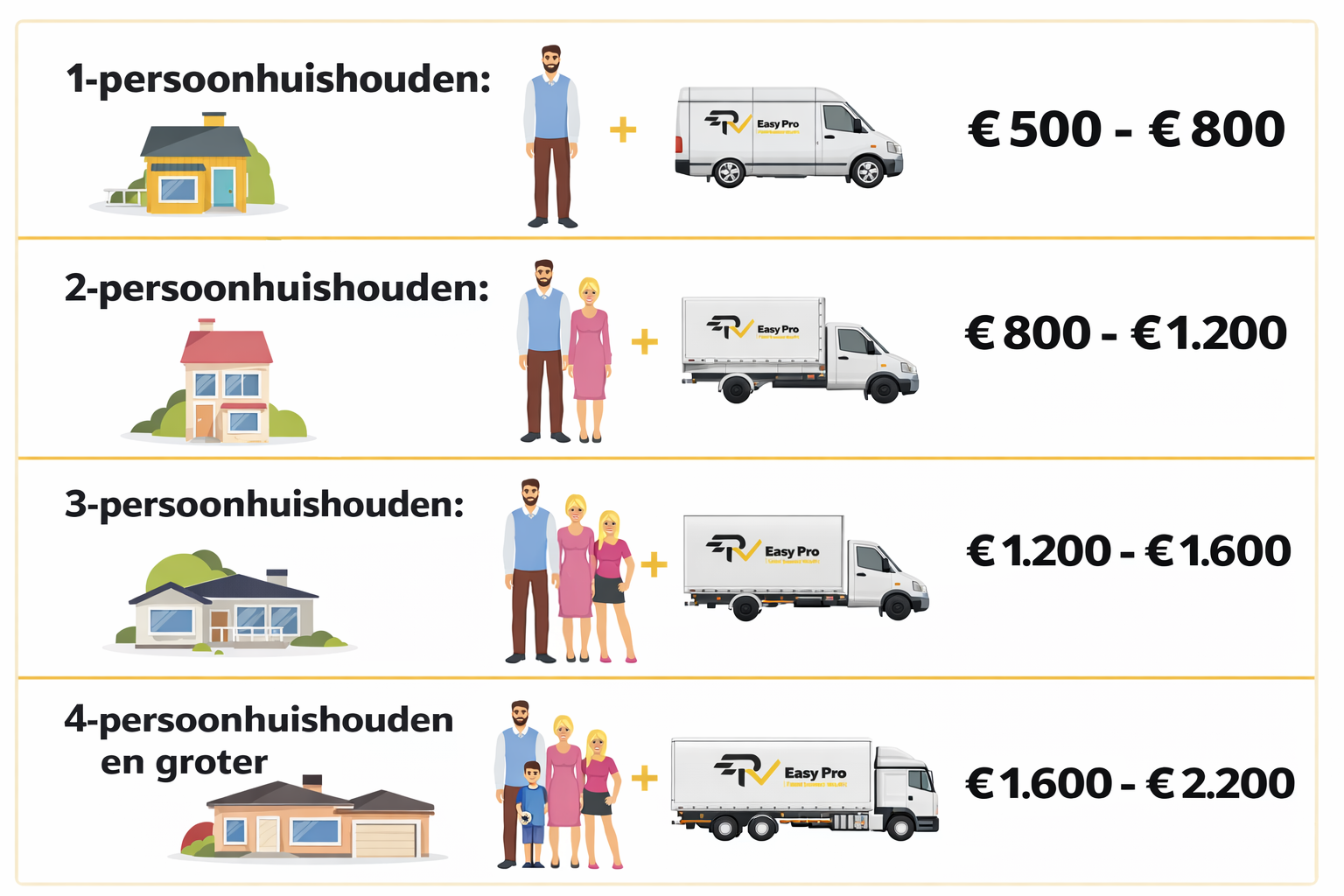 Ook dit is afhankelijk van de grootte van uw verhuizing, de kosten van het transport hangen af van het type verhuiswagen dat nodig is. - Eventuele aanvullende kosten en/of verhuisservices: